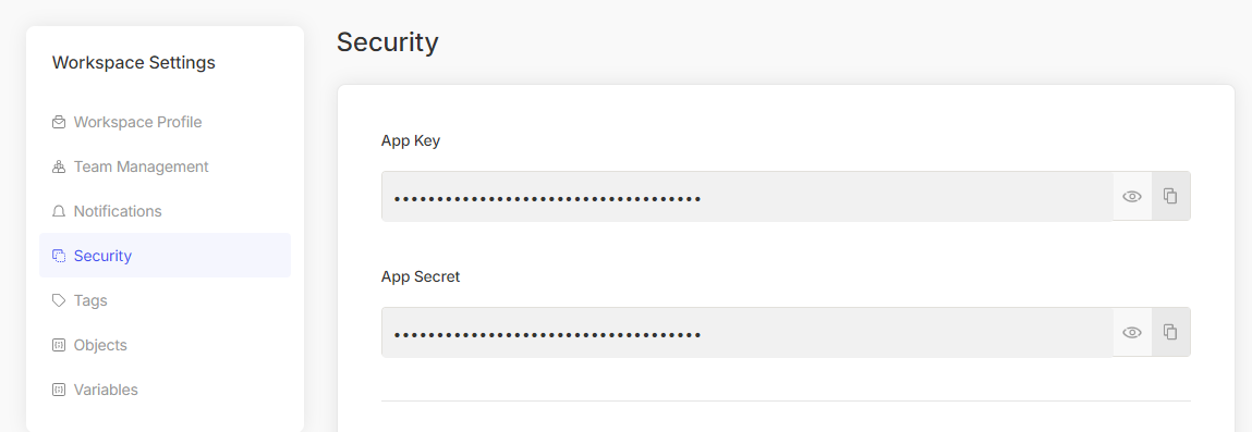 You can view and copy your `App-Key` and `App-Secret` from the [Workspace Settings](https://app.integry.io/platform/workspace/security/).